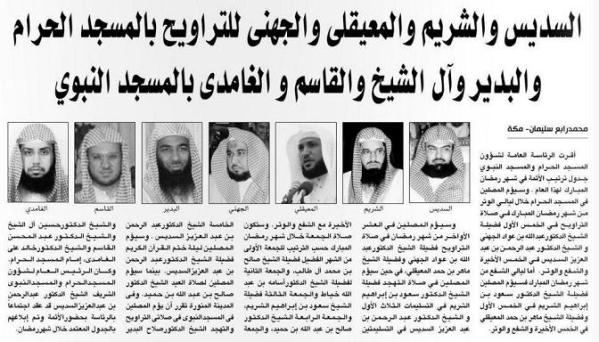 Keratan akhbar di bawah yang mengumumkan imam-imam Masjidil Haram dan Masjid Nabawi untuk tarawih tahun ini 1433H, mengembalikan kenangan bersolat di sana bersama mereka.